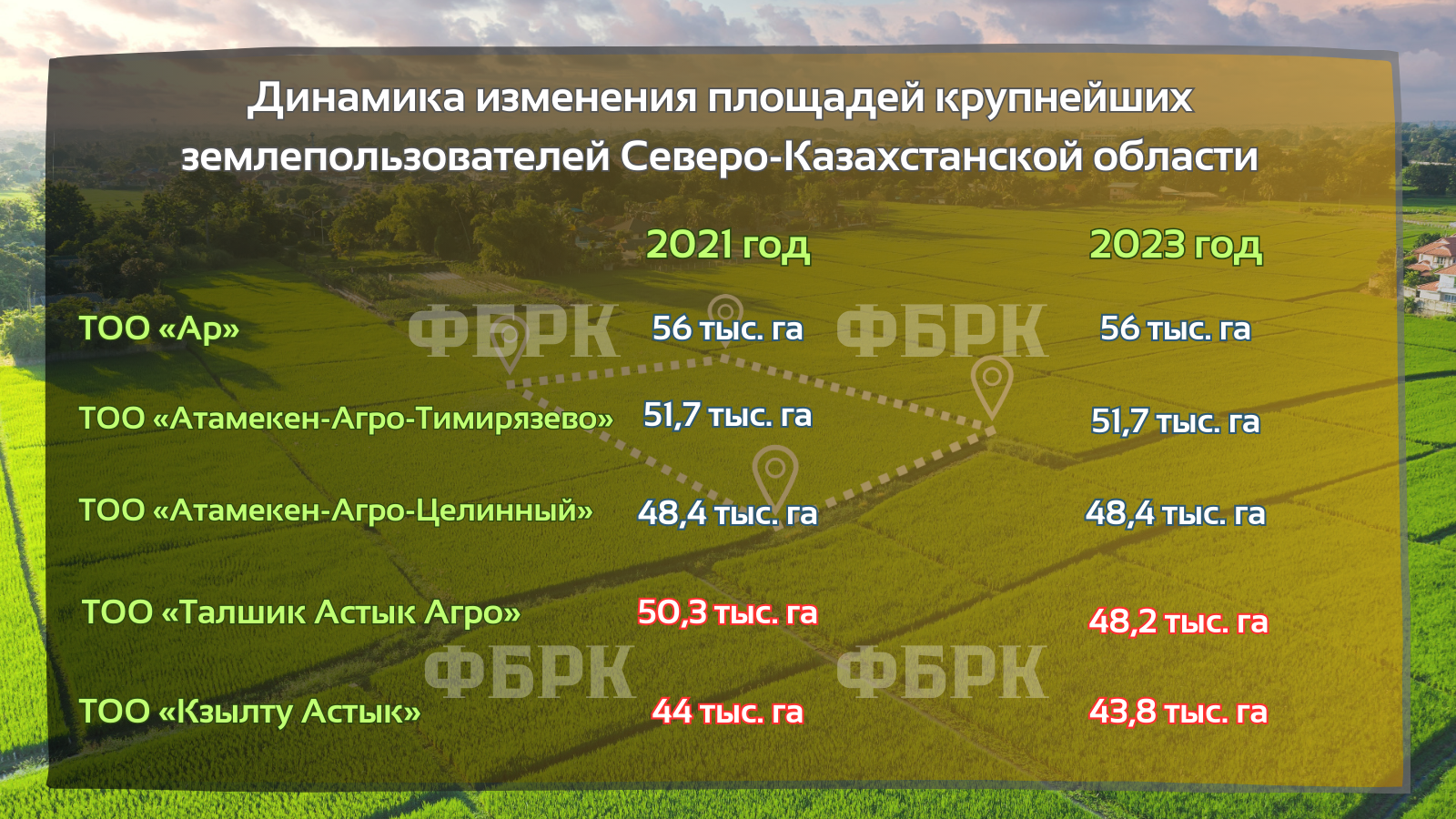 Напомним, редакция ФБРК анализирует динамику крупнейших землепользователей Казахстана с целью выяснить, какое количество сельскохозяйственных земель было изъято у них за последнее время.
